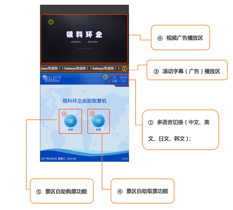 Self-service ticket machine, supports multi-language operation, and realizes self-service ticket purchase, online order ticket exchange, scenic video/information/advertising/publishing functions (simultaneous text and video playback). The equipment is placed outside the scenic spot, which can greatly reduce labor costs and the probability of complaints from tourists, and is very convenient for tourists to purchase tickets and collect tickets, and reduce the pressure for ticket purchase on the sales window.